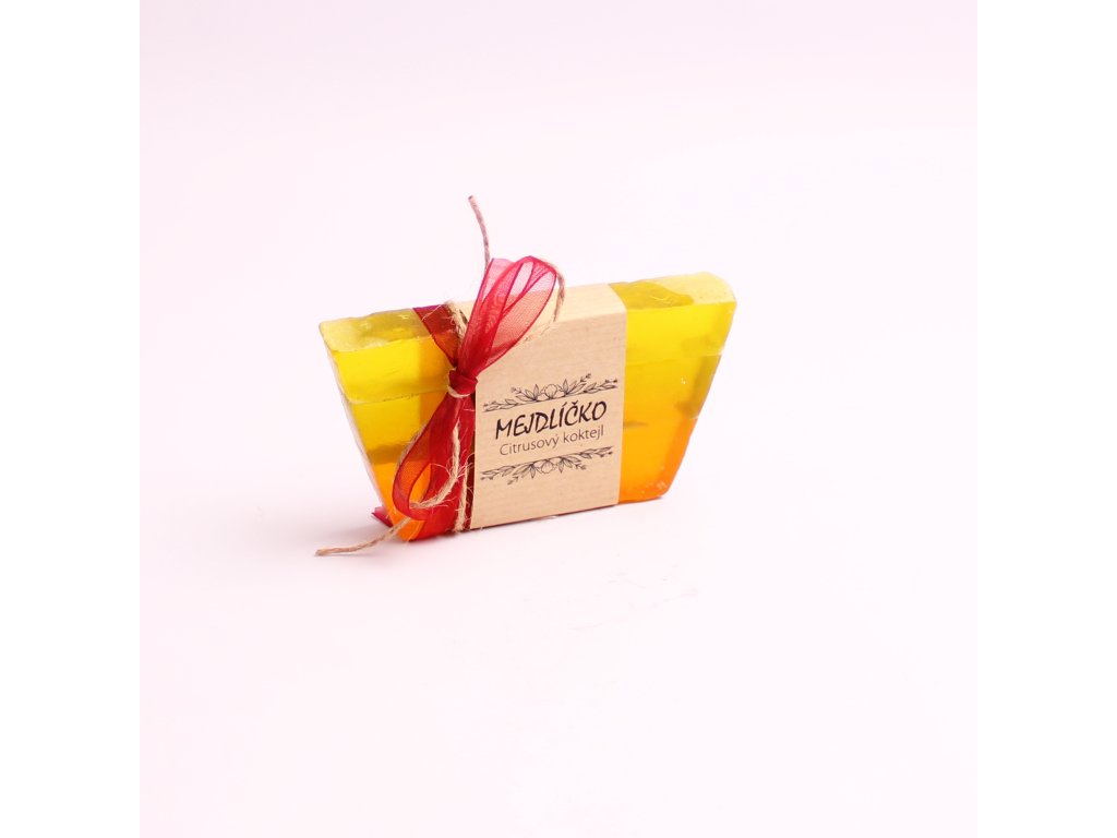 Ručně vyráběné glycerinové mýdlo ve tvaru cihličky s vůní citrusů.